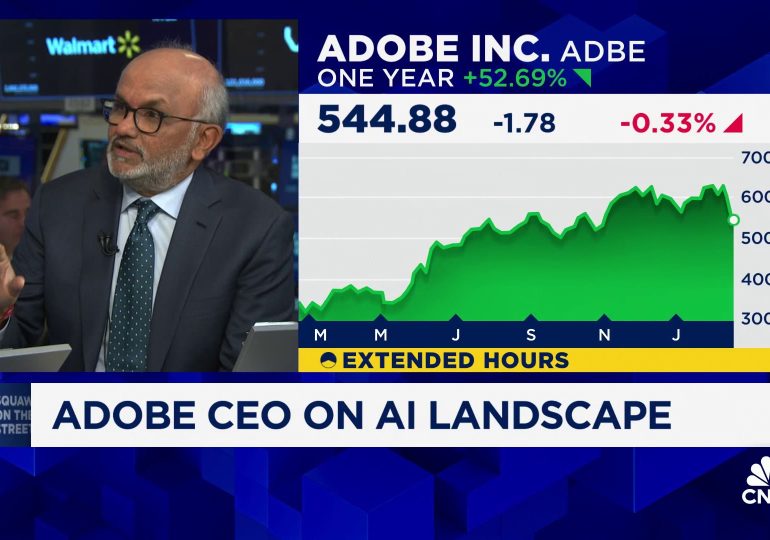 Adobe CEO Shantanu Narayen speaks during an interview with CNBC on the floor of the New York Stock Exchange on Feb. 20, 2024. Brendan Mcdermid |...