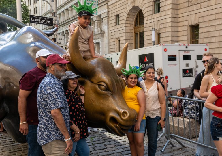 People pose for pictures at the Wall Street Bull in New York’s Financial District on June 24, 2024 in New York City. Spencer Platt | Getty...