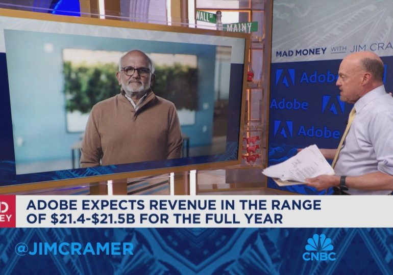 Adobe CEO Shantanu Narayen speaks during an interview with CNBC on the floor at the New York Stock Exchange on Feb. 20, 2024. Brendan Mcdermid |...
