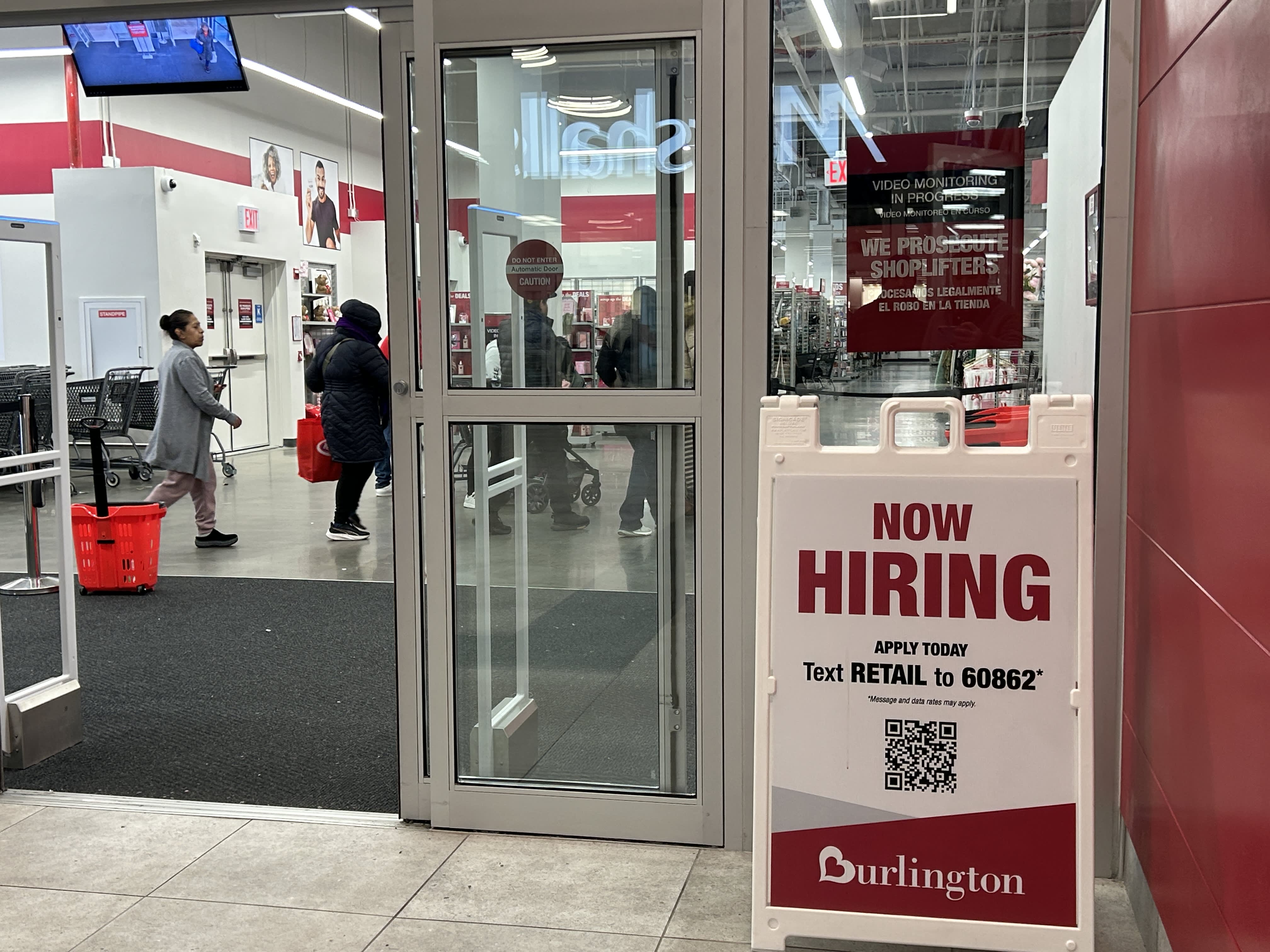Now Hiring sign and QR code for application, Burlington Coat Factory store, Queens, New York.