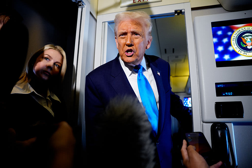 U.S. President Donald Trump speaks to journalists in Japan aboard Air Force One en route to South Korea on October 29, 2025.